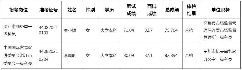 根據(jù)《2021年度湛江市商務(wù)局公開選調(diào)公務(wù)員公告》的要求,經(jīng)資格審核、筆試、面試、體檢、考察、集體研究等環(huán)節(jié),現(xiàn)確定秦小娟同志作為湛江市商務(wù)局一級科員擬選調(diào)人選、李鳳明同志作為中國國際貿(mào)易促進(jìn)委員會湛江市委員會一級科員擬選調(diào)人選,現(xiàn)按規(guī)定予以公示。公示期間,如對擬選調(diào)錄用人員有異議,請以書面形式(包括必要的證明材料)向湛江市商務(wù)局提出,并寫明聯(lián)系人姓名和聯(lián)系電話,匿名信函將不予受理。