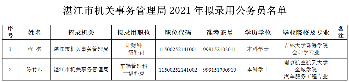 湛江市機(jī)關(guān)事務(wù)管理局2021年擬錄用公務(wù)員公示