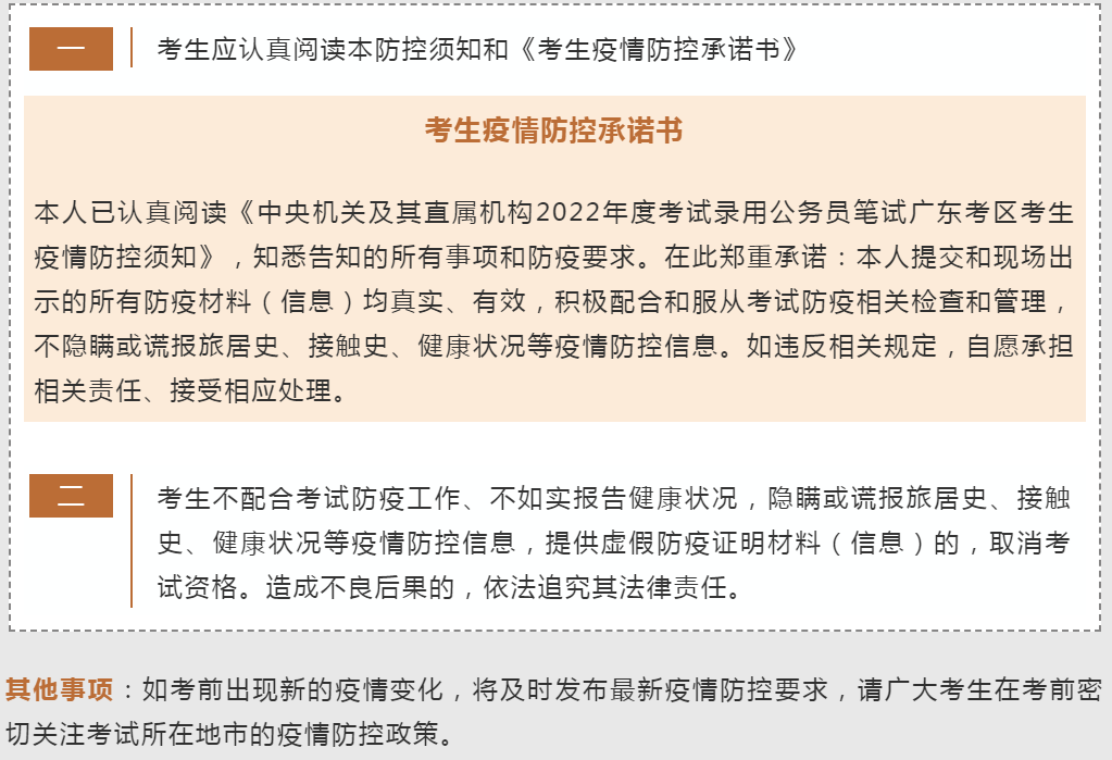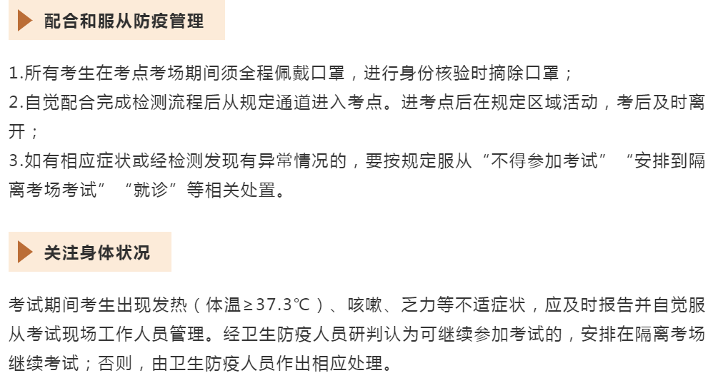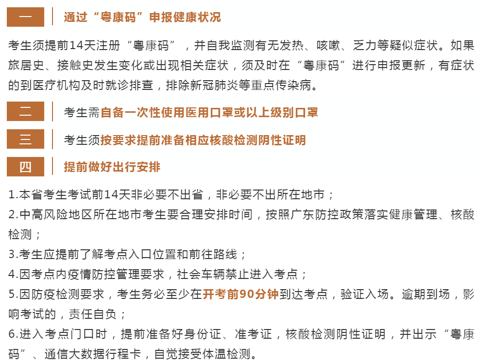 不得參加考試 1.“粵康碼”為紅碼或黃碼的考生; 2.正處于隔離治療期的確診病例、無癥狀感染者,以及隔離期未滿的密切接觸者、次密切接觸者; 3.未按照廣東防控政策完成健康管理的考生; 4.不能提供考前(以每科目開考時間為準(zhǔn),下同)72小時內(nèi)核酸檢測陰性證明的考生。 正常參加考試 “粵康碼”為綠碼,通信大數(shù)據(jù)行程卡正常(考前14天內(nèi)無國內(nèi)中高風(fēng)險地區(qū)及所在地市(直轄市為區(qū),下同)旅居史),憑考前72小時內(nèi)核酸檢測陰性證明,經(jīng)現(xiàn)場測量體溫正常(體溫<37.3℃)的考生可正常參加考試。 安排至隔離考場考試 1.密切接觸者解除隔離后7天內(nèi)的考生; 2.考前14天內(nèi)(不含考試當(dāng)天)有發(fā)熱等疑似癥狀的考生; 3.現(xiàn)場測量體溫不正常(體溫≥37.3℃),在臨時觀察區(qū)適當(dāng)休息后使用水銀體溫計再次測量體溫仍然不正常的,考生近14天無中高風(fēng)險地區(qū)所在地市旅居史,先在隔離考場考試再檢測核酸; 4.發(fā)生本地疫情時,封閉區(qū)、封控區(qū)的考生,能提供考前48小時內(nèi)核酸檢測陰性證明,且由現(xiàn)場指揮部組織評估,出具放行條,實現(xiàn)專人專車閉環(huán)接轉(zhuǎn)。 安排至隔離考場的前3類考生均須提供考前72小時內(nèi)核酸檢測陰性證明。