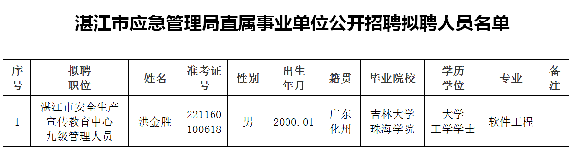 湛江市應(yīng)急管理局直屬事業(yè)單位公開招聘擬聘人員公示
