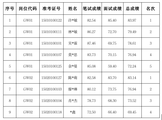 根據(jù)《湛江市人力資源和社會保障局2025年度招聘雇員公告》要求,經(jīng)報名、資格審核、筆試、面試,現(xiàn)將湛江市人力資源和社會保障局2025年度招聘雇員總成績公布如下: