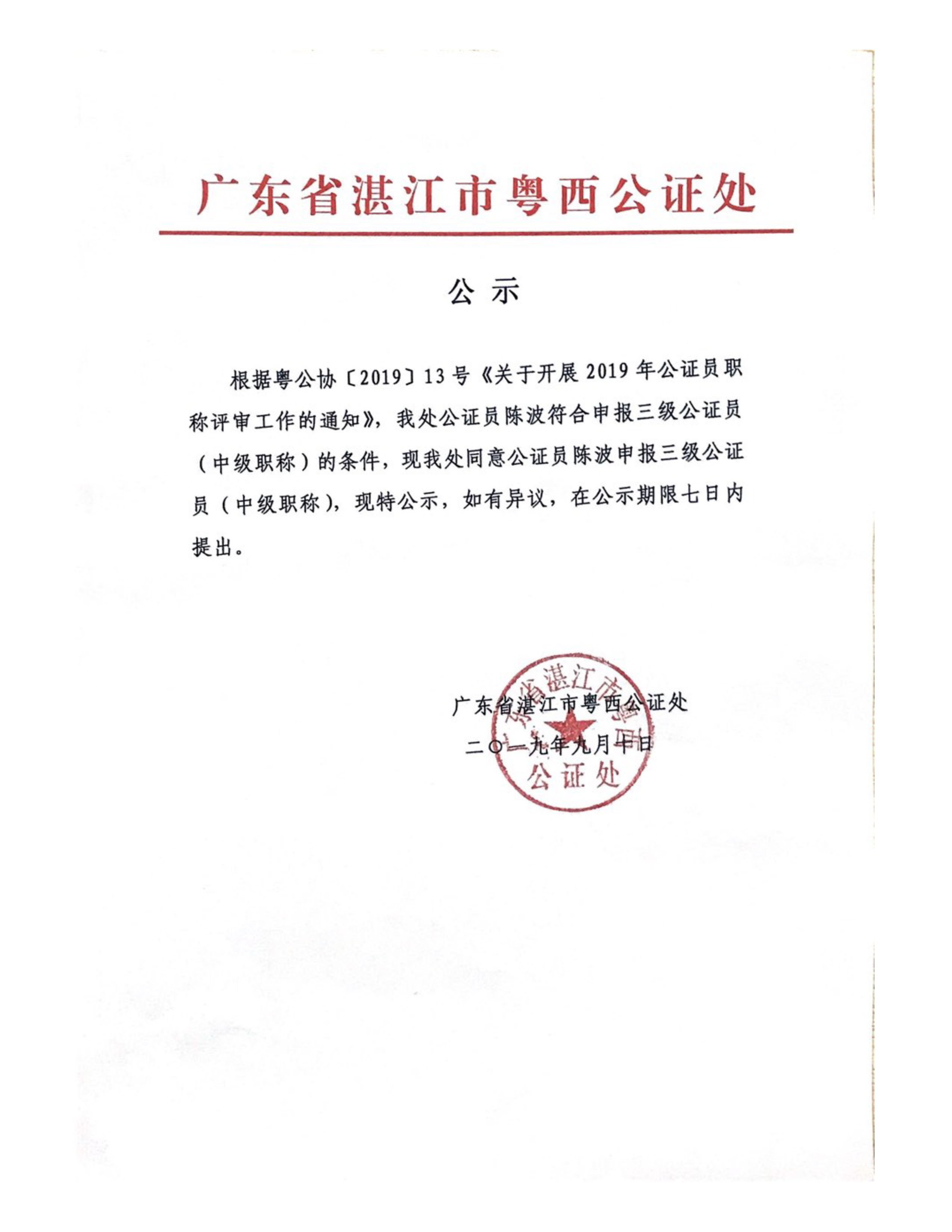 2019年公證員職稱申報公示
