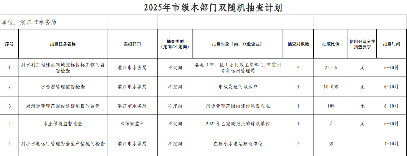 湛江市水務(wù)局2025年雙隨機抽查計劃