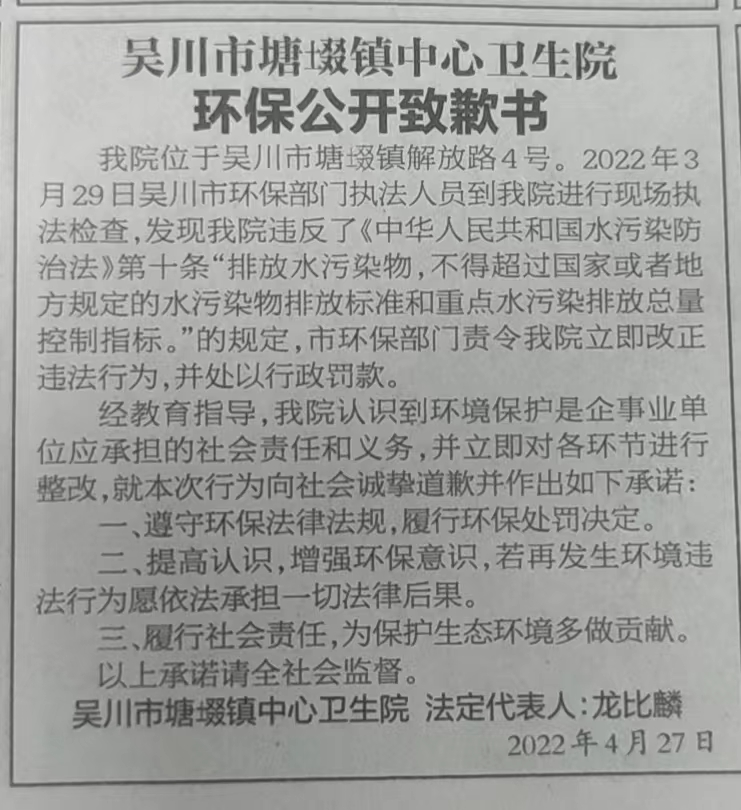 吳川市塘?鎮(zhèn)中心衛(wèi)生院于2022年4月27日在湛江日報公開道歉并作出守法承諾。