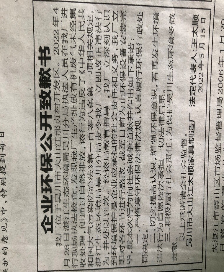 吳川市大山江太順家具制造廠于2022年5月15日在湛江日報公開道歉并作出守法承諾。