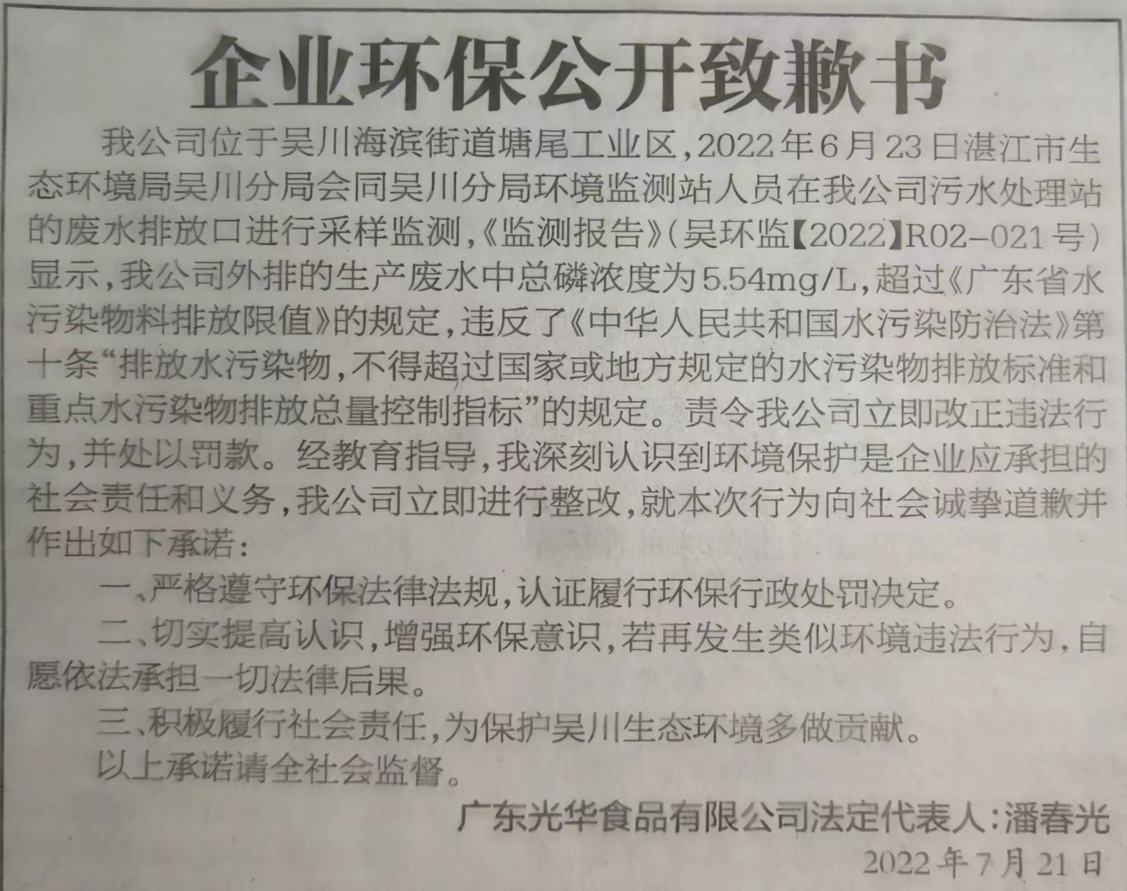 廣東光華食品有限公司于2022年7月22日在湛江日報公開道歉并作出守法承諾。