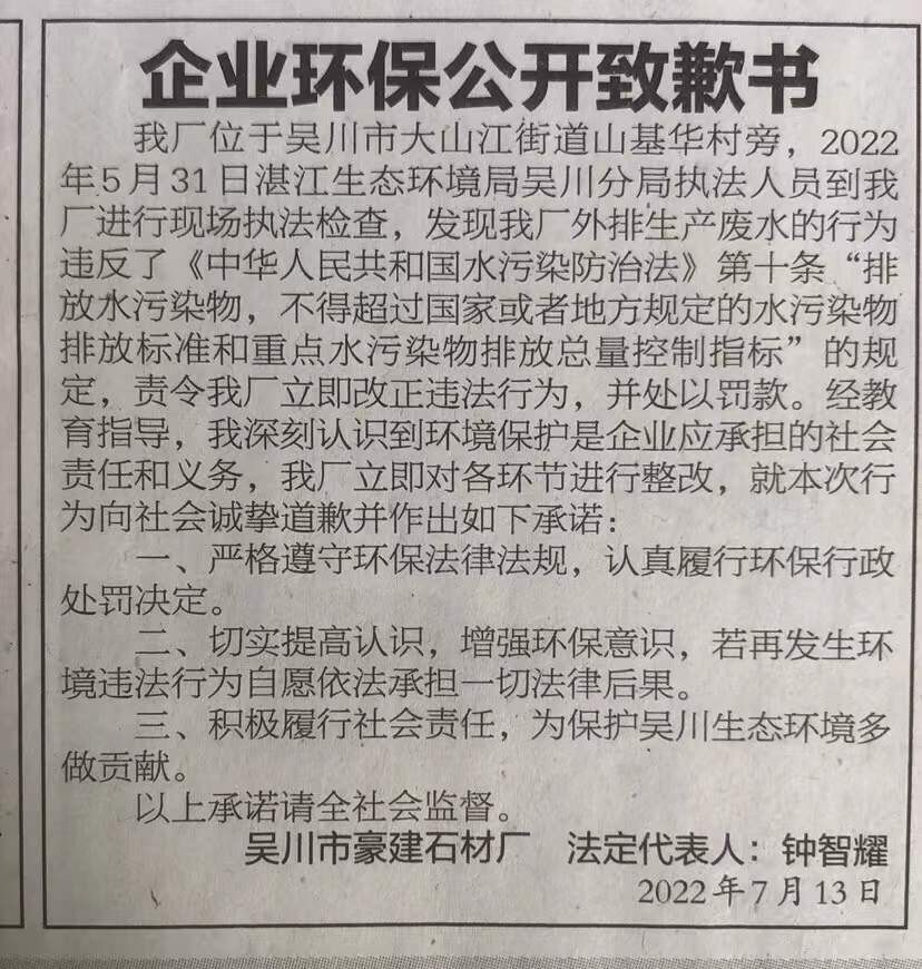 吳川市豪建石材廠于2022年7月15日在湛江日報公開道歉并作出守法承諾。