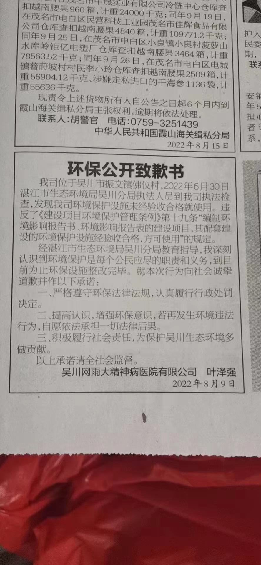 吳川網(wǎng)雨大精神病醫(yī)院于2022年8月11日在《湛江日報》A09版公開道歉并作出環(huán)保守法承諾。