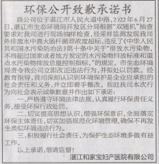 湛江和家寶婦產(chǎn)醫(yī)院有限公司于2022年9月10日在湛江日報公開道歉并作出守法承諾。