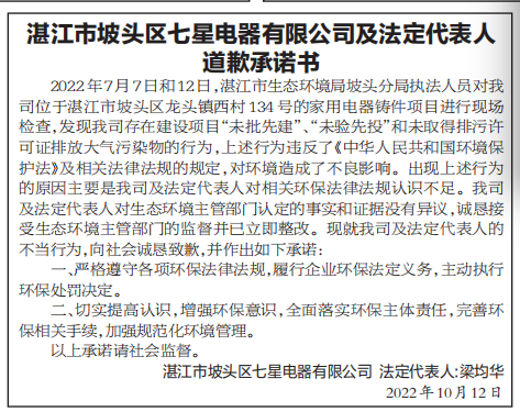 湛江市坡頭區(qū)七星電器有限公司于2022年10月14日在湛江日報A11版登報,公開道歉并做出守法承諾。