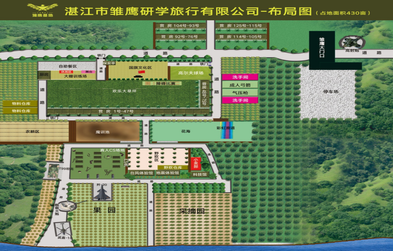 湛江市雛鷹研學(xué)旅行有限公司前身為2017年成立的“湛江合勵文化傳播有限公司(湛江市雛鷹基地)”,具備獨立法人資質(zhì)。公司打造的“湛江市雛鷹基地”集“三防”教育、素質(zhì)拓展、研學(xué)旅行、家庭教育、農(nóng)業(yè)體驗于一體,是一家面向大、中、小學(xué)生和城鄉(xiāng)居民進(jìn)行研究性主題教育、軍事技能訓(xùn)練、校外研學(xué)實踐的綜合性社會實踐基地,也是粵西地區(qū)功能最完善、綜合實力最強的實踐基地和軍事體驗園?;叵群蟊徽J(rèn)定為“廣東省環(huán)境教育基地”、“湛江市中小學(xué)生研學(xué)實踐教育基地”和“廣東海洋大學(xué)產(chǎn)學(xué)研實踐基地”。