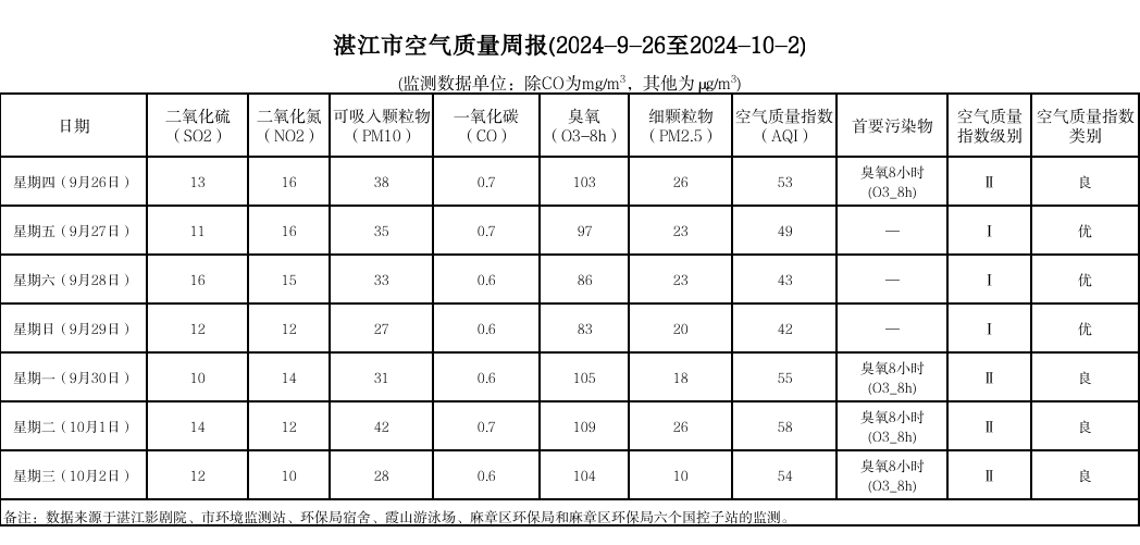 湛江市空氣質(zhì)量周報(2024-9-26至2024-10-2)