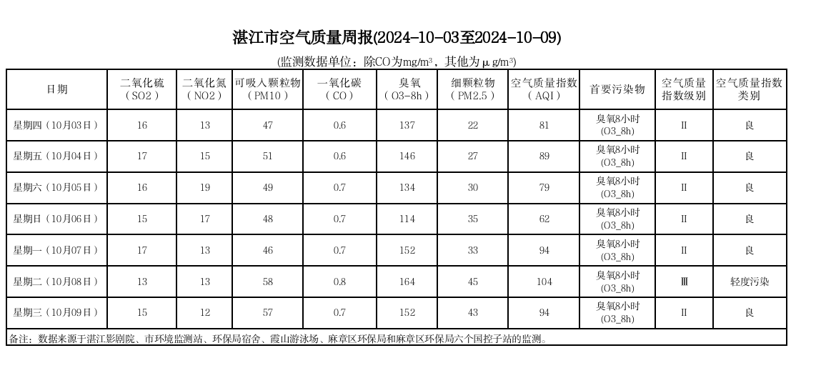 湛江市空氣質(zhì)量周報(bào)(2024-10-03至2024-10-09)