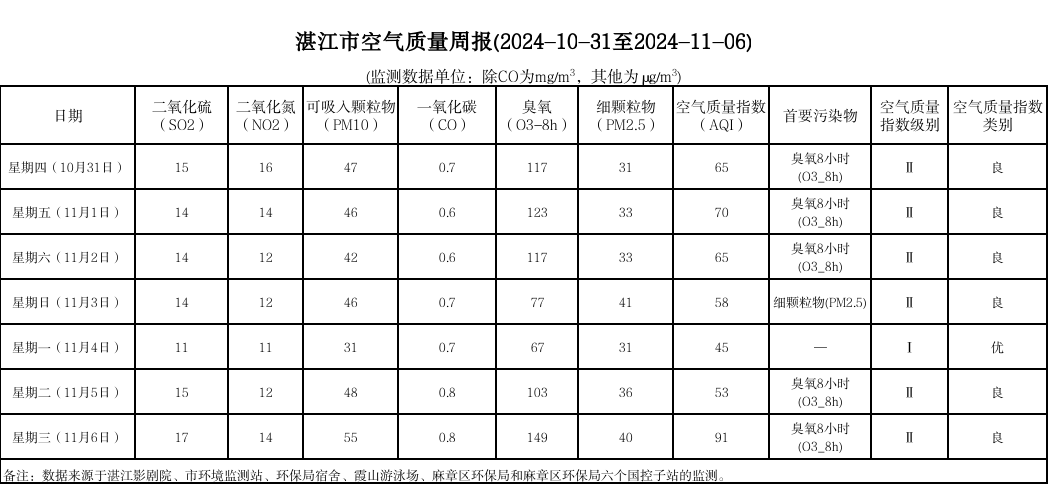 湛江市空氣質(zhì)量周報(bào)(2024-10-31至2024-11-06)