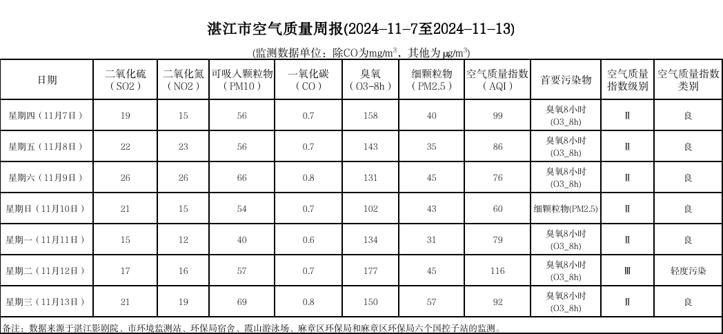 湛江市空氣質(zhì)量周報(2024-11-7至2024-11-13)