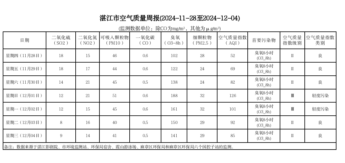 湛江市空氣質(zhì)量周報(bào)(2024-11-28至2024-12-04)