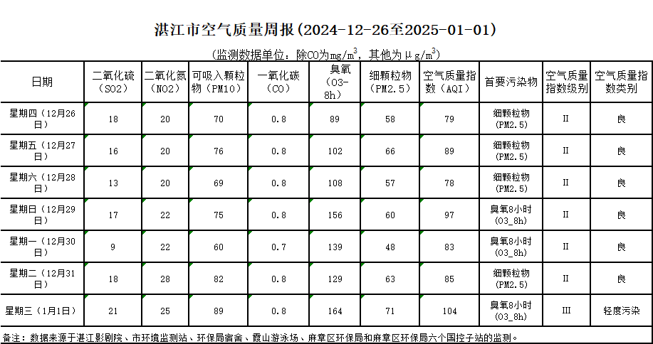 湛江市空氣質(zhì)量周報(2024-12-26至2025-01-01)