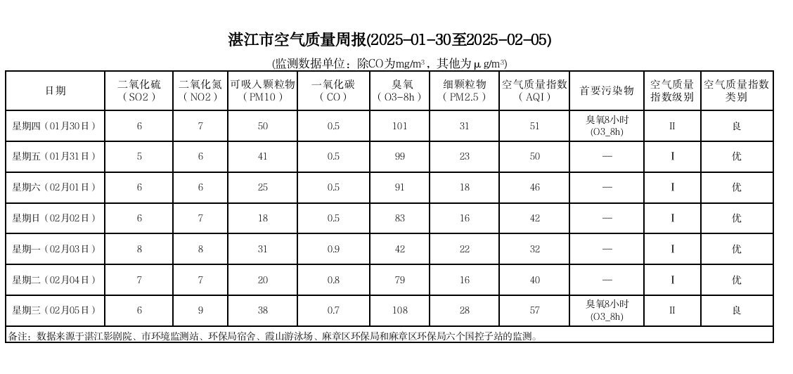 湛江市空氣質(zhì)量周報(bào)(2025-01-30至2025-02-05)