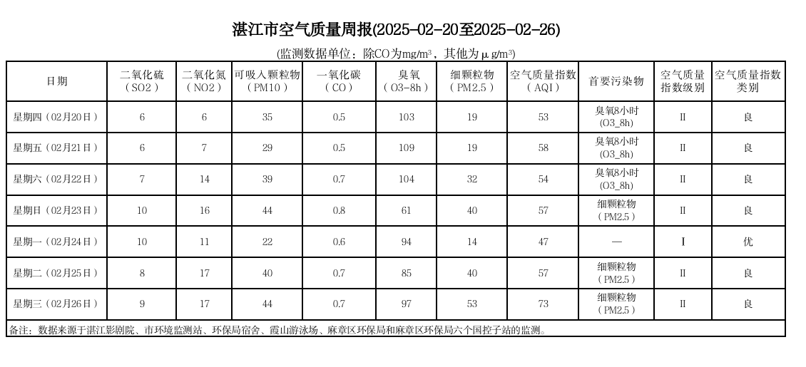 湛江市空氣質量周報(2025-02-20至2025-02-26)