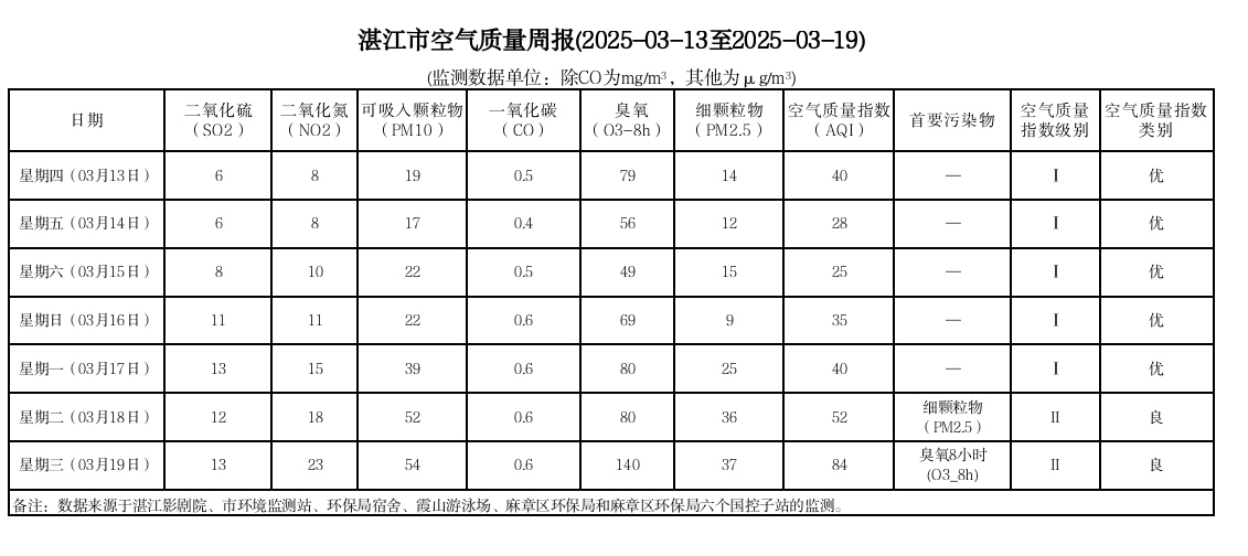 湛江市空氣質(zhì)量周報(2025-03-13至2025-03-19)