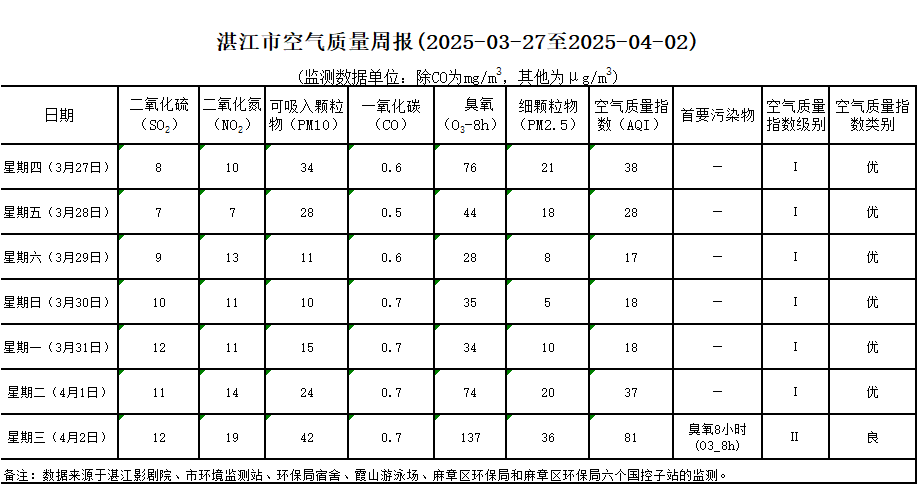 湛江市空氣質(zhì)量周報(2025-03-27至2025-04-02)