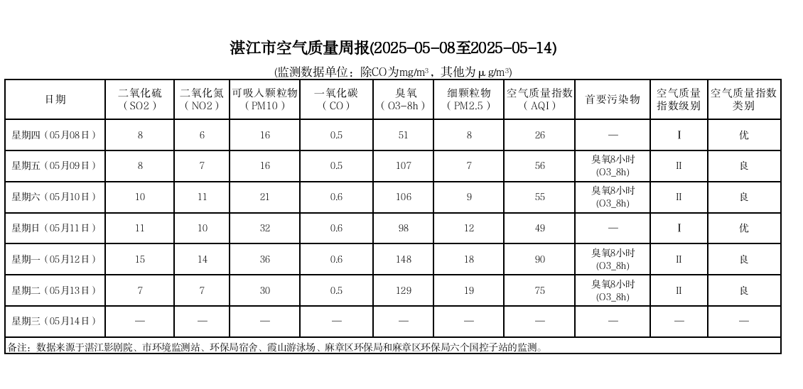 湛江市空氣質(zhì)量周報(2025-05-08至2025-05-14)