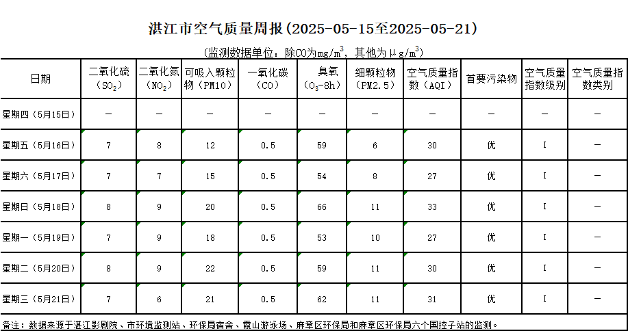 湛江市空氣質(zhì)量周報(2025-05-08至2025-05-14)