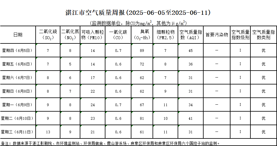 湛江市空氣質(zhì)量周報(2025-06-05至2025-06-11)