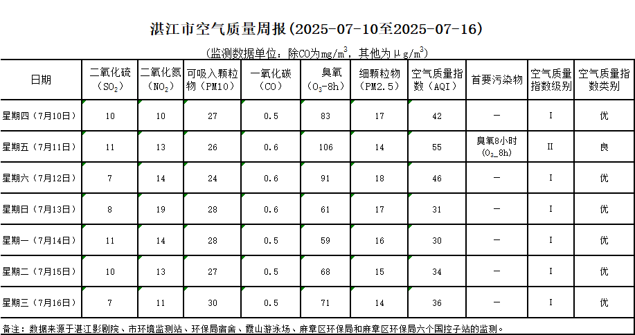 湛江市空氣質(zhì)量周報(bào)(2025-07-10至2025-07-16)