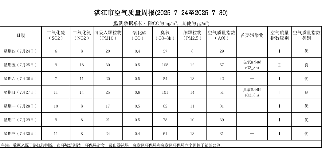 湛江市空氣質(zhì)量周報(bào)(2025-07-24至2025-07-30)