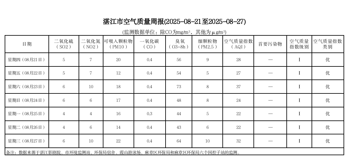 湛江市空氣質(zhì)量周報(2025-08-21至2025-08-27)
