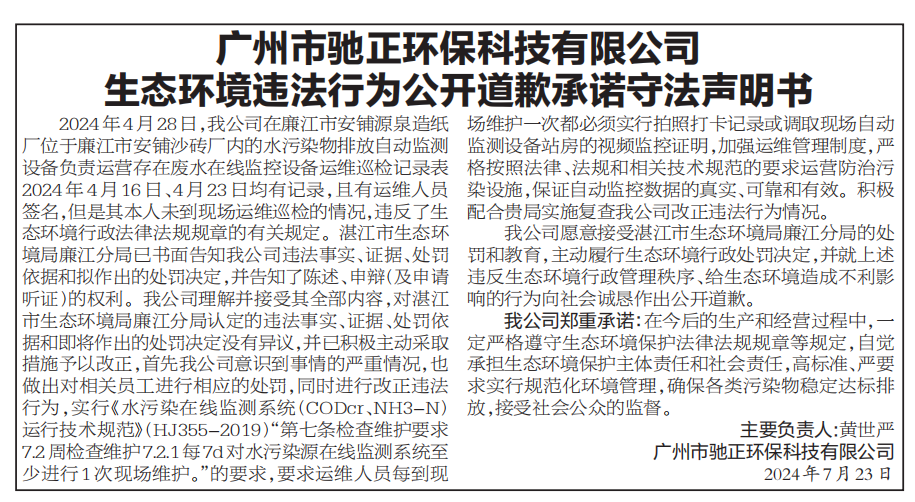 廣州市馳正環(huán)??萍加邢薰居?/span>2024年7月23日在《湛江日?qǐng)?bào)》公開(kāi)道歉,作出履行行政處罰決定和環(huán)保守法承諾。