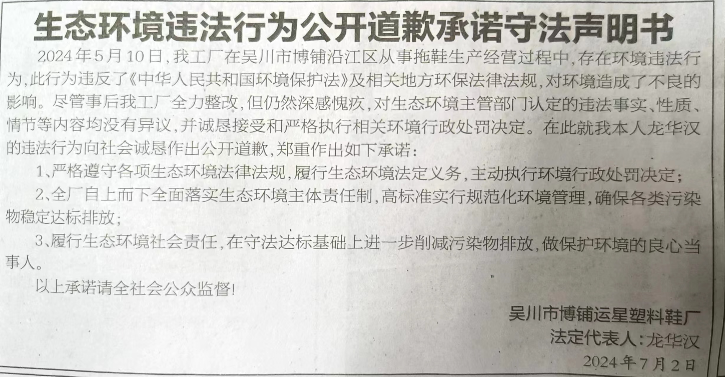吳川市博鋪運(yùn)星塑料鞋廠于2024年7月2日在《湛江日?qǐng)?bào)》公開(kāi)道歉,作出履行行政處罰決定和環(huán)保守法承諾。