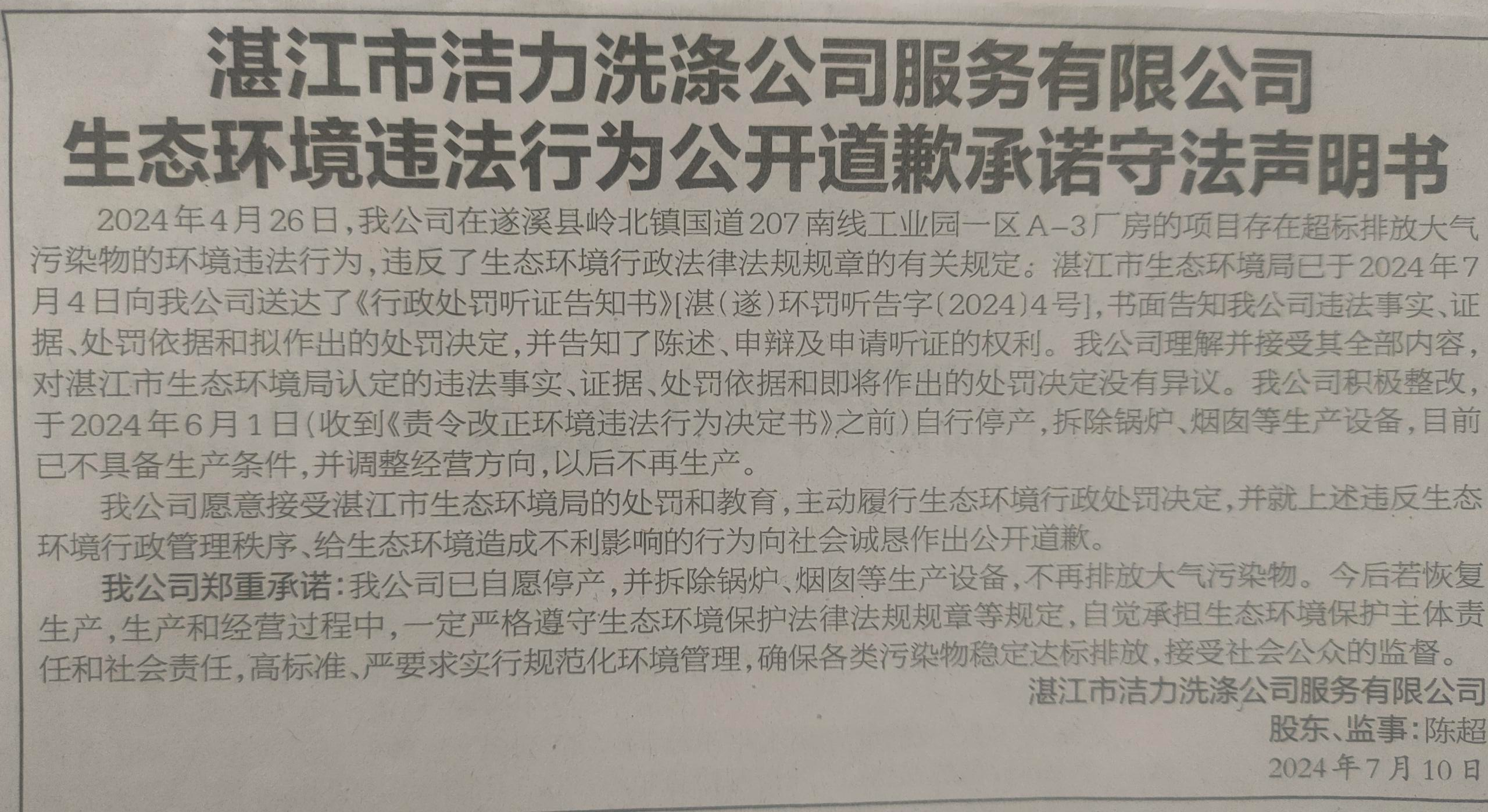 湛江市潔力洗滌服務(wù)有限公司于2024年7月10日在《湛江日?qǐng)?bào)》公開(kāi)道歉,作出履行行政處罰決定和環(huán)保守法承諾。