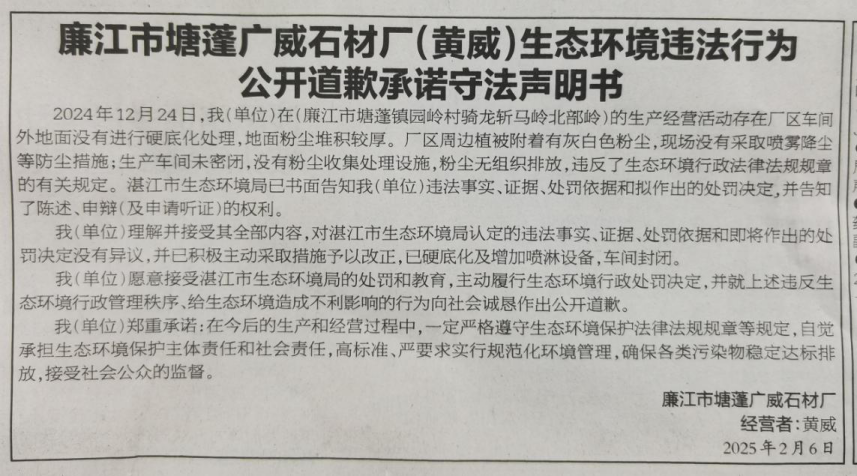 湛江市2025年部分生態(tài)環(huán)境違法主體登報(bào)公開(kāi)道歉(一)