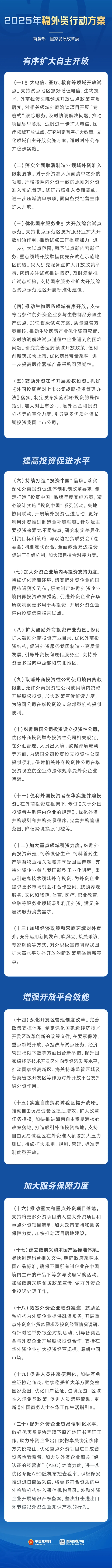 有序擴(kuò)大自主開放、提高投資促進(jìn)水平、增強(qiáng)開放平臺(tái)效能、加大服務(wù)保障力度,《2025年穩(wěn)外資行動(dòng)方案》發(fā)布,從4方面提出了20條措施。