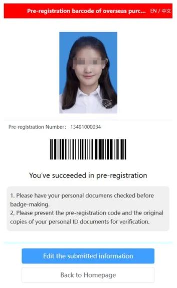 方法一:請掃描下方預(yù)注冊二維碼獲得電子回執(zhí),適用于申請首張證件、因丟失或忘記攜帶采購商證申請補辦,以及因個人原因申請更換證件。