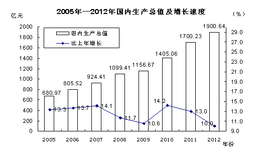 初步核算,全年實(shí)現(xiàn)生產(chǎn)總值(GDP)1900.64億元,按可比價(jià)格計(jì)算,比上年增長10.0%。其中,第一產(chǎn)業(yè)增加值385.35億元,增長6.6%;第二產(chǎn)業(yè)增加值803.07億元,增長13.0%;第三產(chǎn)業(yè)增加值712.22億元,增長8.4%。三次產(chǎn)業(yè)結(jié)構(gòu)20.3﹕42.2﹕37.5。在第三產(chǎn)業(yè)中,交通運(yùn)輸、倉儲(chǔ)和郵政業(yè)增長8.7%,批發(fā)和零售業(yè)增長11.8%,住宿和餐飲業(yè)增長14.6%,金融業(yè)增長13.8%,房地產(chǎn)業(yè)增長4.4%,其他服務(wù)業(yè)增長6.3%。民營經(jīng)濟(jì)增加值1121.81億元,比上年增長16.1%。全市人均GDP達(dá)到26810元,按平均匯率折算為4247美元。