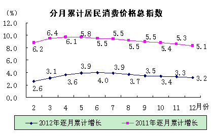 2012年市區(qū)居民消費(fèi)價(jià)格比上年漲跌情況