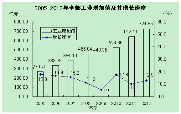 ?全年全部工業(yè)完成增加值724.85億元,比上年增長12.9%。規(guī)模以上工業(yè)企業(yè)實(shí)現(xiàn)增加值581.41億元,增長12.1%;其中:國有及國有控股企業(yè)實(shí)現(xiàn)增加值133.55億元,增長5.1%;股份制企業(yè)實(shí)現(xiàn)增加值162.48億元,增長45.2%;外商及港澳臺(tái)企業(yè)實(shí)現(xiàn)增加值