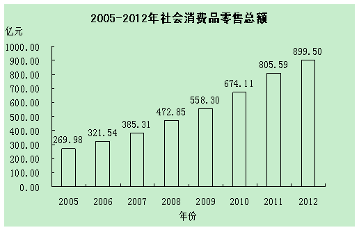 全年社會(huì)消費(fèi)品零售總額899.50億元,增長12.1%,扣除物價(jià)因素,實(shí)際增長10.0%。其中,城鎮(zhèn)消費(fèi)品零售額795.96億元,占全市社會(huì)商品零售額的88.5%,增長15.2%;鄉(xiāng)村消費(fèi)品零售額103.54億元,占全市商品零售總額的11.5%,下降7.2%。分行業(yè)看,批發(fā)業(yè)零售額87.22億元, 增長14.0%;零售業(yè)零售額692.51億元,增長11.6%;住宿業(yè)零售額8.81億元,增長12.4%,餐飲業(yè)零售額110.96億元,增長13.6%。