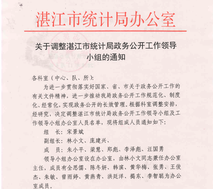 關(guān)于調(diào)整湛江市統(tǒng)計局政務(wù)公開工作領(lǐng)導(dǎo)小組的通知