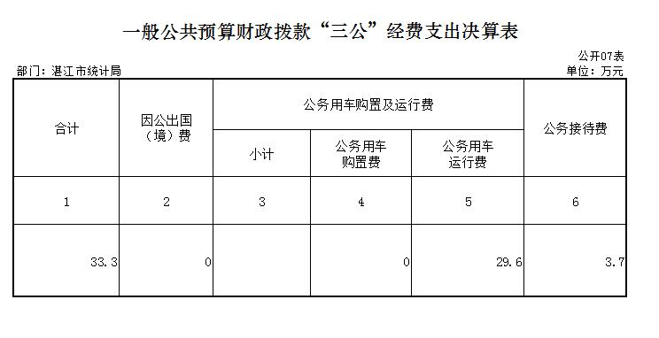 “三公”經(jīng)費(fèi)包括因公出國(guó)(境)費(fèi)、公務(wù)用車購(gòu)置及運(yùn)行維護(hù)費(fèi)和公務(wù)接待費(fèi)。2014年湛江市統(tǒng)計(jì)局財(cái)政撥款“三公”經(jīng)費(fèi)支出合計(jì)33.3萬(wàn)元,比上年減少 1.1萬(wàn)元。其中:今年公出國(guó)(境)費(fèi)沒有;公務(wù)用車購(gòu)置及運(yùn)行維護(hù)費(fèi)29.6萬(wàn)元,占88 %,比上年減少26.7萬(wàn)元,減少的原因主要一是2014年沒有計(jì)劃購(gòu)置公務(wù)車,因此公務(wù)用車運(yùn)行維護(hù)費(fèi)比年減少26.7萬(wàn)元;公務(wù)接待費(fèi) 3.69 萬(wàn)元,比上年減少0.1萬(wàn)元,減少的原因主要是嚴(yán)格執(zhí)行中央“八項(xiàng)規(guī)定“,嚴(yán)控公務(wù)接待開支,促使公務(wù)接待費(fèi)用下降。