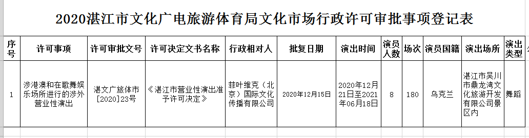 2020湛江市文化廣電旅游體育局文化市場行政許可審批事項(xiàng)登記表(2020.12.26)