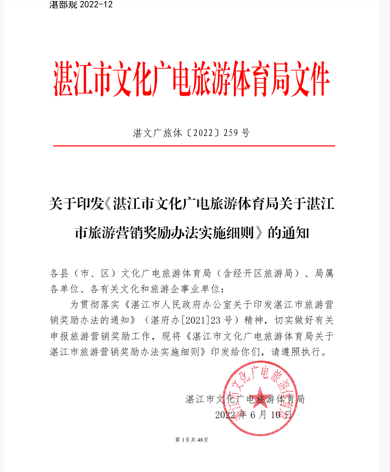 關(guān)于印發(fā)《湛江市文化廣電旅游體育局關(guān)于湛江市旅游營(yíng)銷(xiāo)獎(jiǎng)勵(lì)辦法實(shí)施細(xì)則》的通知