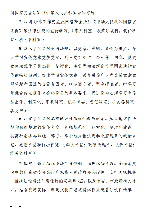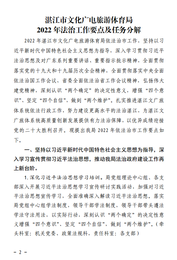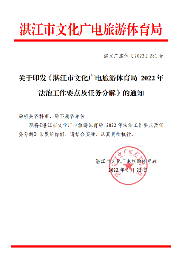 湛江市文化廣電旅游體育局關(guān)于印發(fā)《湛江市文化廣電旅游體育局 2022 年法治工作要點(diǎn)及任務(wù)分解》的通知