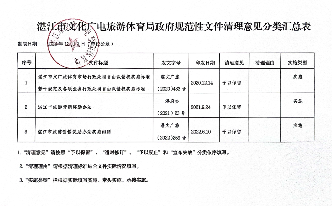湛江市文化廣電旅游體育局政府規(guī)范文件清理意見分類匯總表