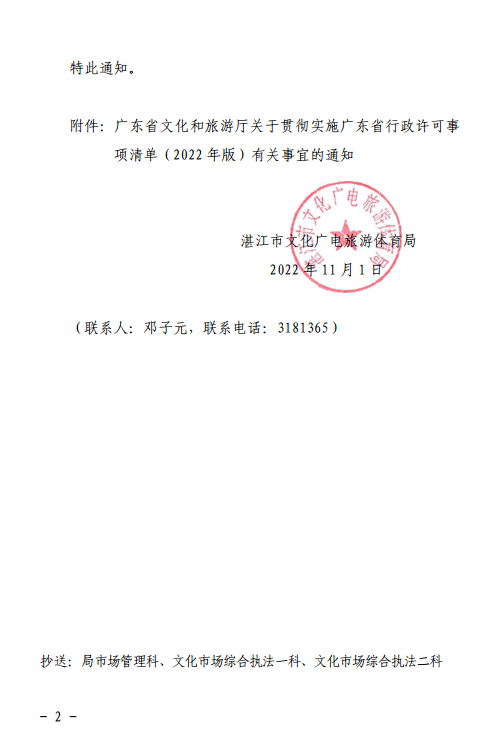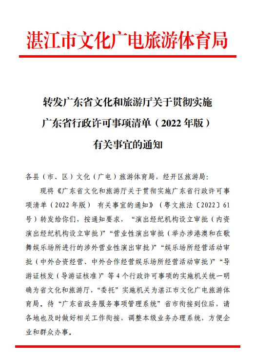 轉(zhuǎn)發(fā)廣東省文化和旅游廳關(guān)于貫徹實(shí)施廣東省行政許可事項(xiàng)清單(2022年版) 有關(guān)事宜的通知