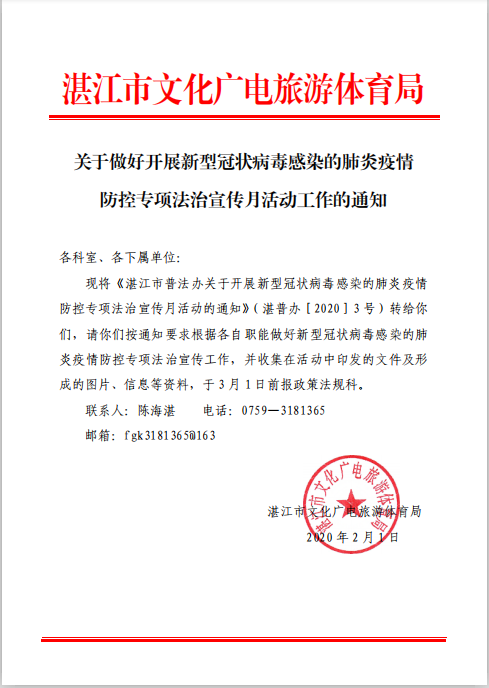 關(guān)于做好開展新型冠狀病毒感染的肺炎疫情防控專項(xiàng)法治宣傳月活動(dòng)工作的通知