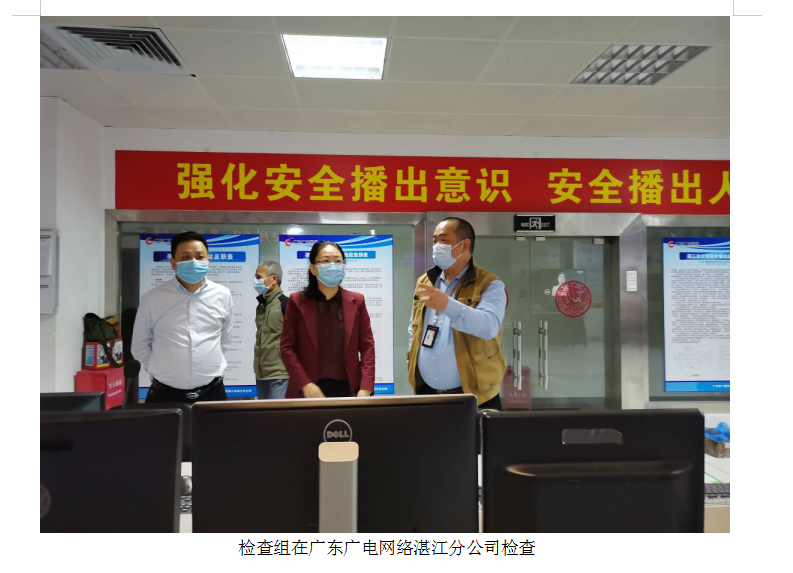1月28日-2月5日, 為做好2021年春節(jié)、“兩會(huì)”期間廣播電視行業(yè)安全保障工作以及新冠疫情防控和宣傳工作,麥冬梅副局長(zhǎng)率局廣播電視管理科對(duì)湛江市廣播電視臺(tái)、廣電網(wǎng)絡(luò)湛江分公司、各縣(市、區(qū))廣播電視臺(tái)、廣播電視站、發(fā)射站、廣播電視節(jié)目制作機(jī)構(gòu)和接收境外衛(wèi)星電視節(jié)目酒店等開展行業(yè)安全檢查,確保我市廣播電視安全播出、網(wǎng)絡(luò)安全、設(shè)施保護(hù)、制作內(nèi)容監(jiān)管、境外衛(wèi)星電視管理等工作有序開展。
